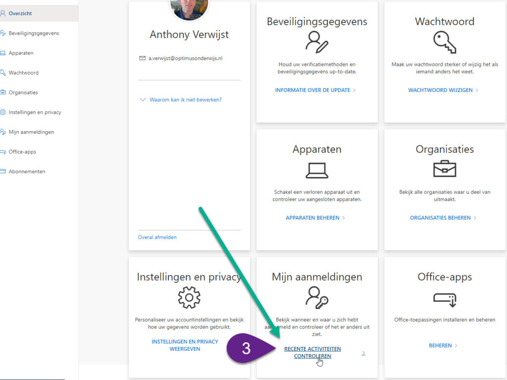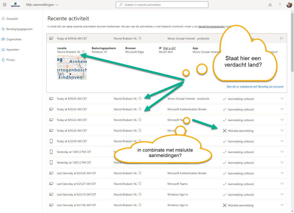Zie je een verdachte inlog (bijv. een vreemd land) met “Aanmelding voltooid?” Neem dan meteen contact op met A.Verwijst@Optimusonderwijs.nl en verander direct je wachtwoord(en).